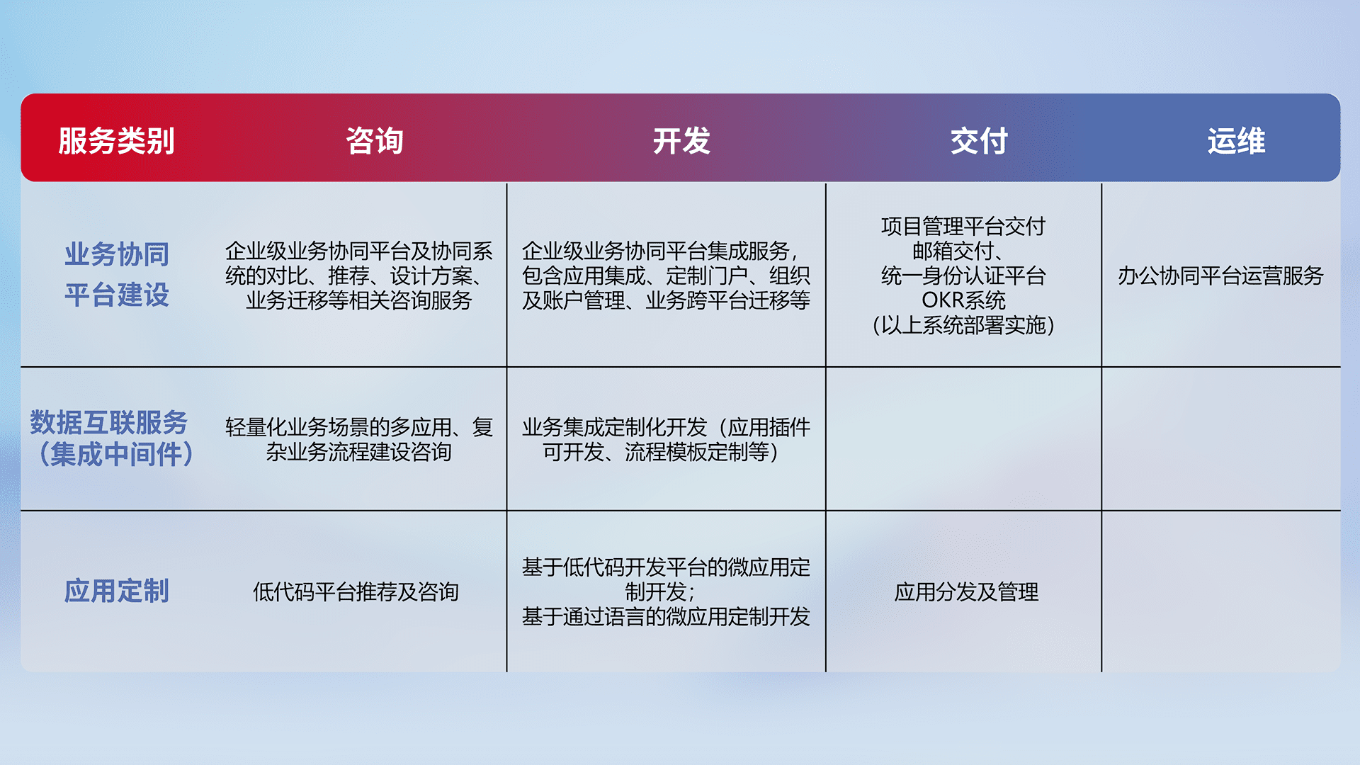 针对钉钉、、、、企微、、、、IDaas等平台级产品提供产品的规划、、方案、、交付、、定制化开发等服务,,,,实现如统一协同办公、、智能客户服务、、混合会议管理、、、、智能数据查询、、、、等业务场景,,,,实现数字化转型。。